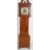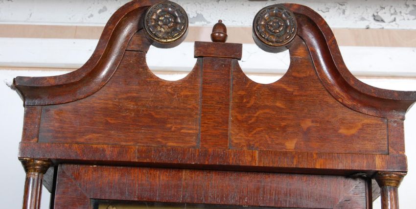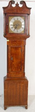 A 19th century Victorian oak cased clock having a brass and silvered metal face with Roman numerals to the chapter ring and spandrels to the corners. The clock hood has a swan neck pediment with column supports atop an oak longcase body. Comes with pendulum and clock weights.