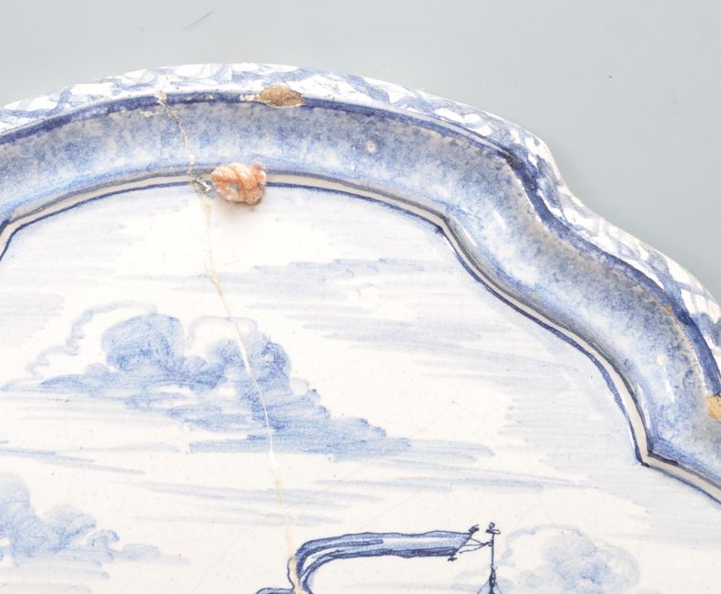 A pair of early 20th century blue and white ceramic Delft wall plaques. Both plaques of an oval form with scrolled edges and raised margins. One decorated with blue and white nautical scenes and one with polychrome wither scenes. Measures: 37cm x 33cm. Condition: A/F