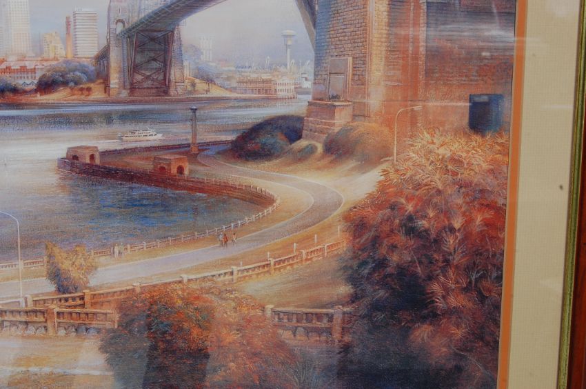 A large vintage retro 20th century lithograph print. The print named “ Sydney From Kirribilli “depicting the Sydney bridge. Framed and glazed.