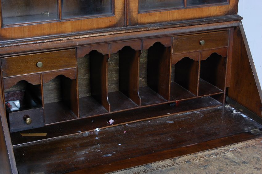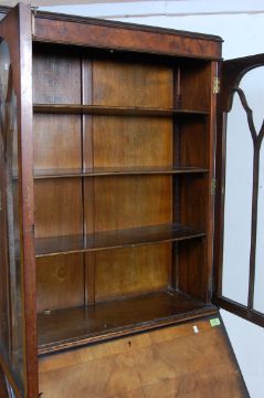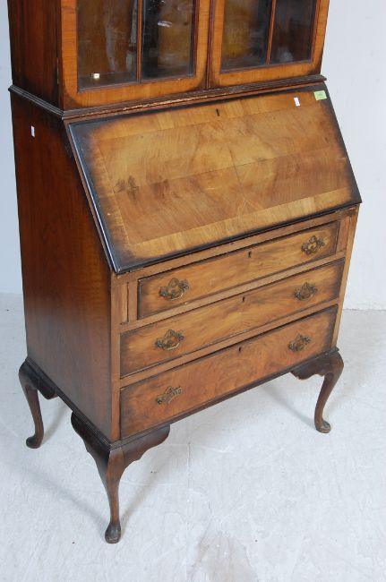 A early 20th century antique circa 1930’s Queen Anne Revival walnut bureau bookcase having twin gazed doors with arched top and adjustable shelves over a bureau with fall front and fitted interior above a bank of three drawers with swan neck handles raised on cabriole legs. Measures 195 x 74 x 44 cm.