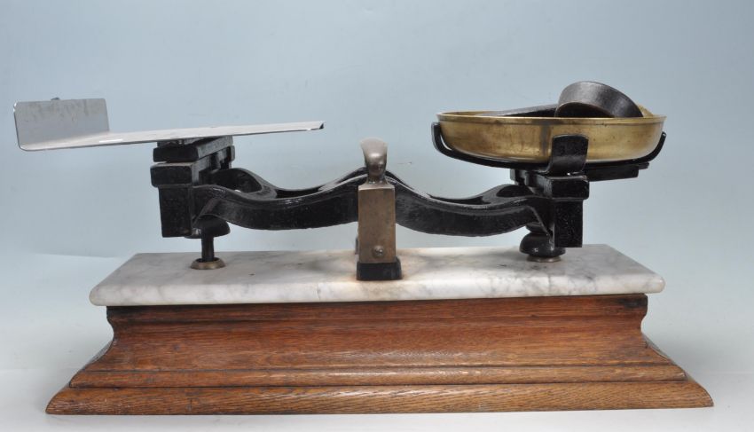 An early 20th century 1920s marble topped butchers balance scales having a brass pan to one side with metal shelf to the other raised on a wooden plinth base. Comes with weights. Measures 60cm wide.