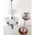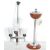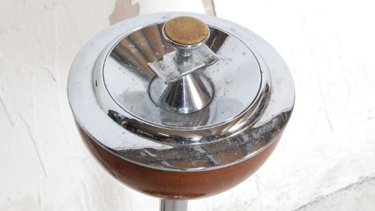 A vintage retro floor standing ash tray having a teak wood base with chromed column with ashtray to the top together with a vintage wooden and chrome ceiling light chandelier having conical frosted shades. Ash try measures 56cm tall, the other measures 76cm.