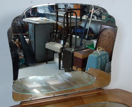 An early 20th century circa 1950’s Art Deco style walnut depressing table. The dressing table having a shaped mirror over a pedestal chest with drop in centre above a bank of drawers flaked by cupboard raised on a plinth base. Measures 140 x 118 x 53cm.