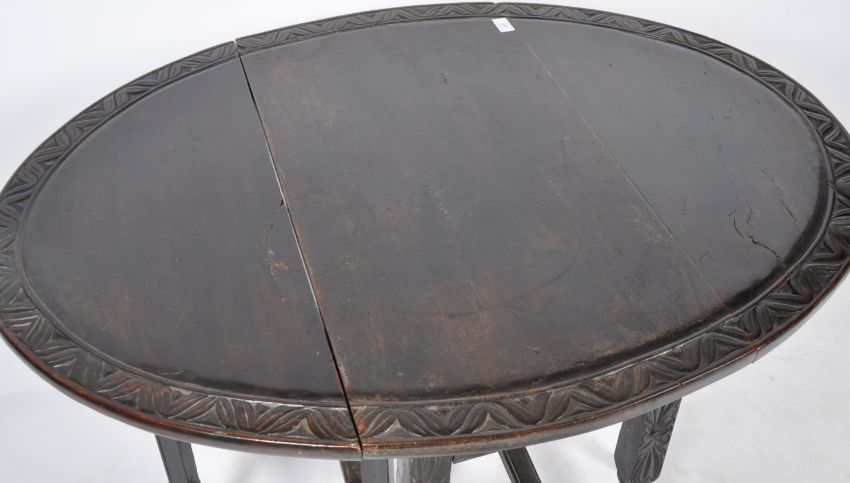 John Murphy - An antique 18th Century Georgian English heavily carved oak gate leg drop leaf table having a carved oak oval top supported by a gate leg oak lages with turned and carved decoration. Label to underside for John Murphy. Measures approx when closed; 70cm  x 77cm x 44cm.