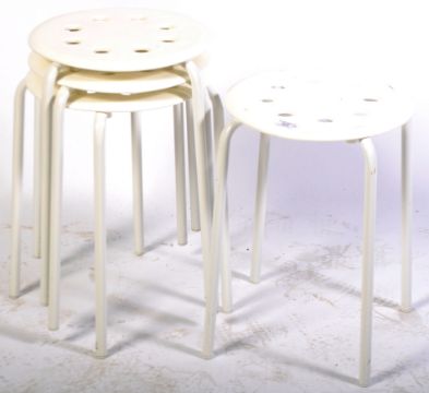 A matching set of four contemporary retro style stools having white moulded plastic circular tops raised on tubular white metal legs. Makers marks for Ikea to each. Each stool measures 46cm x 34cm diameter.