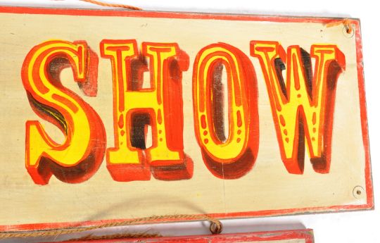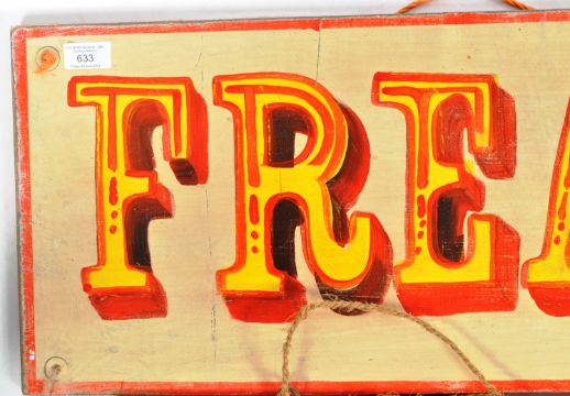 Two original retro vintage mid 20th Century circus fairground ride painted wooden signs tags / sideshow gaff boards comprising ' Burlesque & Freakshow ' Both painted on wooden boards with red lettering and borders. Great examples. Measures approx; 123cm x 30cm.