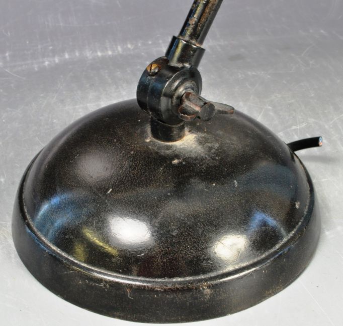 A retro vintage 20th Century Industrial factory work desk lamp having a black enamel shade with twin adjustable arm raised on a domed circular base. Position changes via tightening of the wing nuts. No plus and some age related wear to the finish. Measures approx; 50cm.
