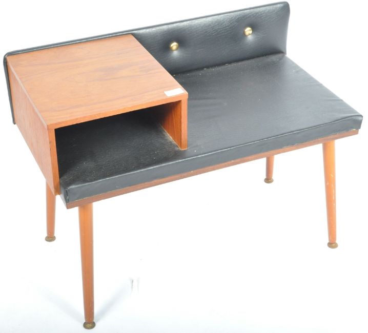 A retro vintage 20th Century teak wood telephone table having a cushioned black faux leather vinyl seat and back with teak wood phone rest and open storage section. All raised on tapering cylindrical legs with brass feet floor adjusters. Some minor age related wear but overall in good condition. Measures approx; 55cm x 74cm x 40cm.