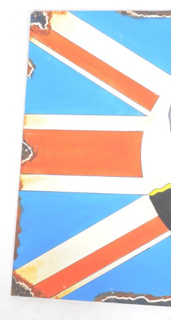 Iconic British Racer - A 20th Century oil on canvas painting artist's impression of a traditional vintage advertising enamel sign. Depicting a male racer with goggles and leather racing cap with a Union Jack background. Measures approx. 61cm x 96cm