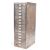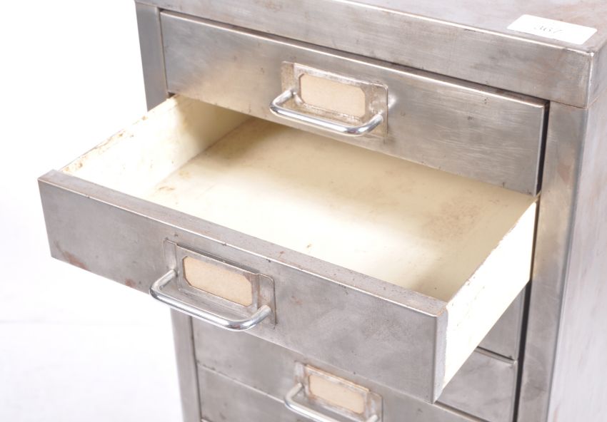 A retro vintage 20th Century upright pedestal multi drawer chest of drawers. Each drawer having aluminum pull handles and notation slides. All raised upon a plinth base. Condition; age related wear. Measures approx; 86cm x 28cm x 41cm.