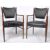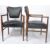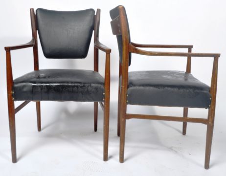 Arne Vodder (Manner Of) - A matching pair of retro vintage 20th Century Danish influenced teak and leather upholstered armchairs / office / dining carver arm chairs. Each chair having a tapering black leather backrest with cylindrical teak supports. Propeller armrests with a cushioned seat pad with all being raised on tapering supports. Each chair measures approx; 87cm x 51cm x 54cm.