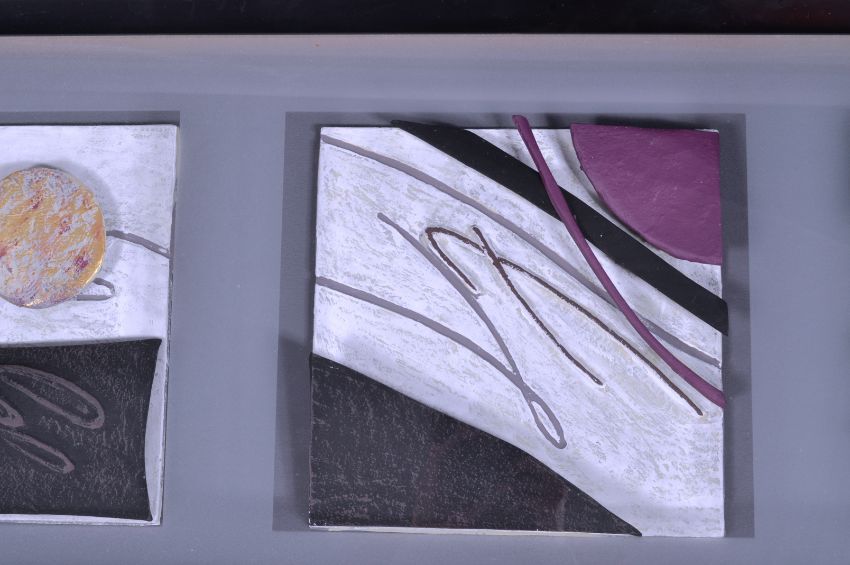 An unusual retro vintage 20th Century three piece 3D sculpture wall art / painting. The price separated into three parts using various protruding shaped with uses of black, purple and white. All set within a 3D frame with frosted glass detailing. Condition; wear to the frame. Measures approx; 45cm x 125cm x 7cm.
