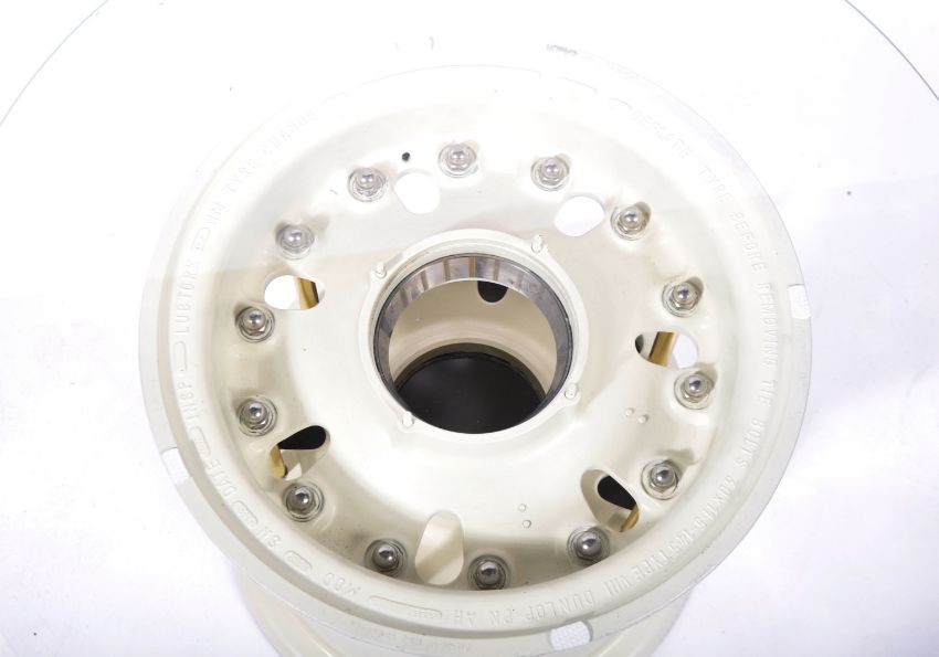An industrial aviation bespoke coffee table / side occasional table made from the main landing wheel / undercarriage wheel of a Tornado Jet Fighter set with a circular glass top. Impressed marks to the rim itself and being finished in white. Measures approx 43cm x 70cm diameter.