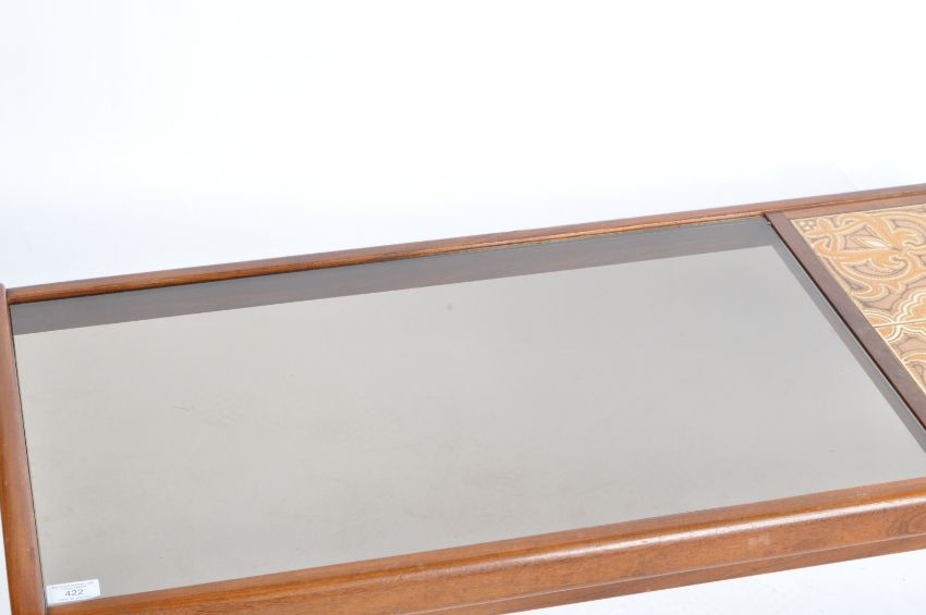 G plan - A retro vintage 20th Century British design teak wood and tile top rectangular coffee table / centre occasional table featuring a three quarter smoked glass top. All being raised on ski leg supports united by stretchers. Condition; age related wear and marks, structurally sound. Measures approx; 47cm x 50cm x 43cm.