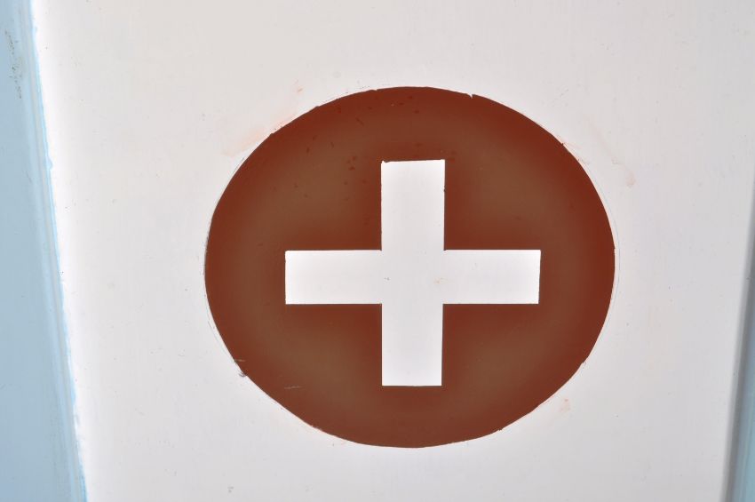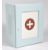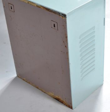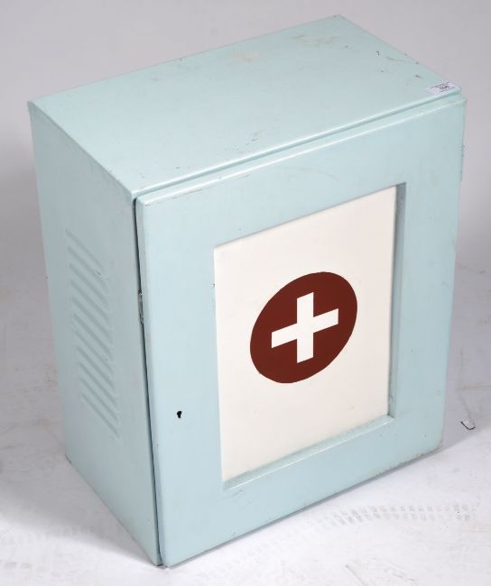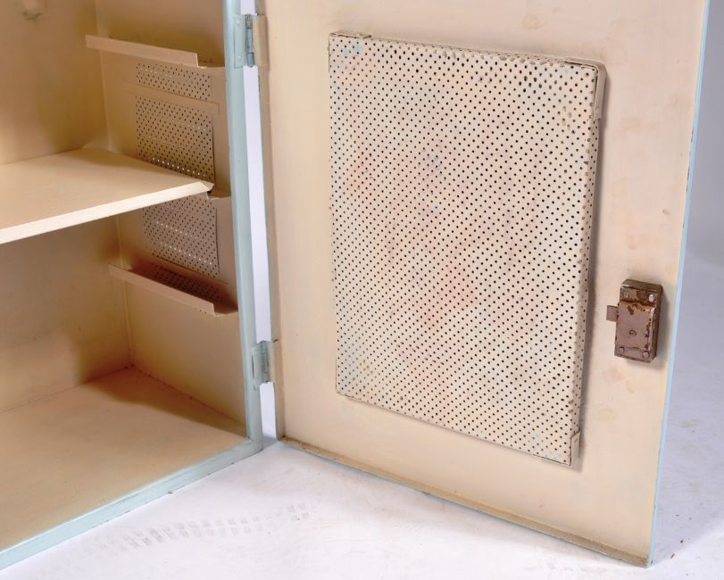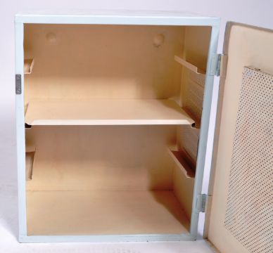 A retro vintage 20th Century upcycled painted hanging medicine / bathroom cabinet finished in light blue with cross to the centre and vented side panels. The door opens to reveal space within. Condition; some wear to the paint, overall good. Measures approx; 56cm x 46cm x 29cm.