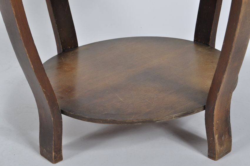 A vintage 20th Century Art Deco English walnut and glass topped coffee table / centre / side occasional table of typical Art Deco style. The table having a piano black glass circular top supported by sweeping legs united by a circular second tier. Condition; age related wear with surface marks to the glass. Measures approx; 49cm x 59cm diameter.