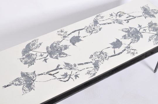 Terence Conran - Habitat - A retro vintage mid 20th Century 1960's formica topped coffee table having a white ground with scrolling grey leaves. Raised on a black metal frame with uniting ebonised wood lower magazine rack tier. Sometimes attributed to John Piper. Measures approx; 35m x 107cm x 38cm. Condition; some wear to the underside wood, some minor marks / scratches to the decoration but overall a good sturdy piece.