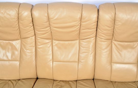 Ekornes Stressless - A contemporary Norwegian three seater reclining sofa settee in cream upholstered leather with thick padded armrests upon beech supports. Condition; wear to the leather, overall good. Measures approx; 102cm x 202cm x 73cm.