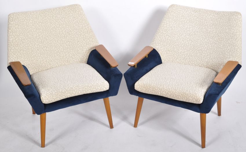 A matching pair of retro vintage 20th Century German easy / lounge chair / armchairs having show wood teak floating arms supported by brass pillars. Each chair having been recently reupholstered and having new seat pads with each being raised on teak tapering supports. Condition; slight age related wear to each, both in good condition. Each arm chair measures approx; 75cm x 73cm x 60cm.