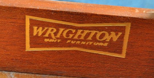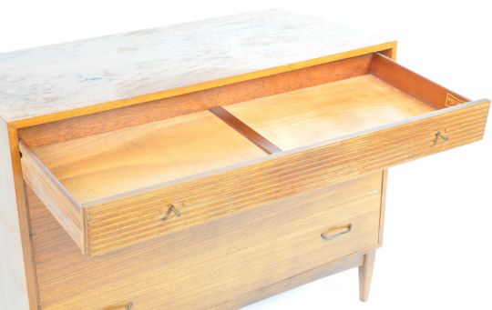 Wrighton Furniture - An original retro vintage 20th Century High End British Design chest of drawers of teak wood construction. The bank of drawers having a single reeded front drawer over three straight with shaped brass handles to each. Raised on cylindrical tapering supports. Condition; some age related wear / marks and chips to the top however is structurally sound and functions well. Measures 77cm x 99cm 46cm.