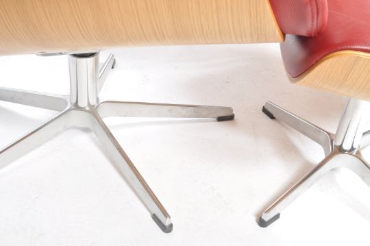 Conform - Spectre - An incredible pair of contemporary high end British design Eames inspired swivel lounge chairs and matching footstools. Bentwood shells with red leather cushioned seat and arms with adjustable neck rests. Raised on an aluminium five point swivel star base. In good clean condition with some very minor marks in pieces. Costed over £6000 when new. Measures approx; 102cm x 80cm x 80cm.