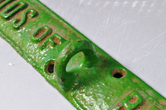 Woods Of Bristol - An original retro vintage early 20th Century cast iron advertising point of sale shop exterior dog tie. Green painted finish with raised text and central hoop. Four fixing holes to front. Measures approx; 36cm x 5cm. A good vintage example with no visible damage.