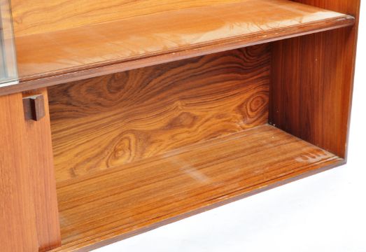 A retro vintage mid 20th Century Danish teak wood low bookcase cabinet having a twin sliding glass doors with adjustable shelves within. Twin blind front sliding doors below having shaped angular handles concealing hollow space within. Condition; age related marks, would have once been raised on legs. Measures approx; 84cm x 153cm x 28cm.