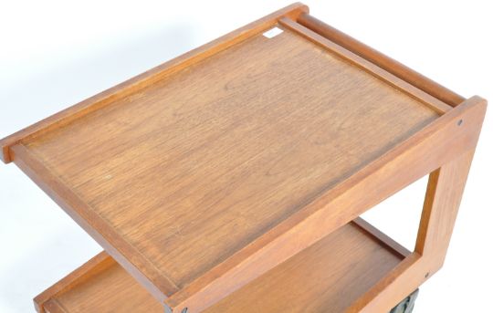 Sika Mobler - A retro vintage mid 20th Century Designer two tier teak serving drinks / cocktails tea trolley having a rectangular top supported by boomerang shaped side panels and second tier below. All being raised on wheels. Condition; overall good, age related marks. Measures approx; 51cm x 70cm.