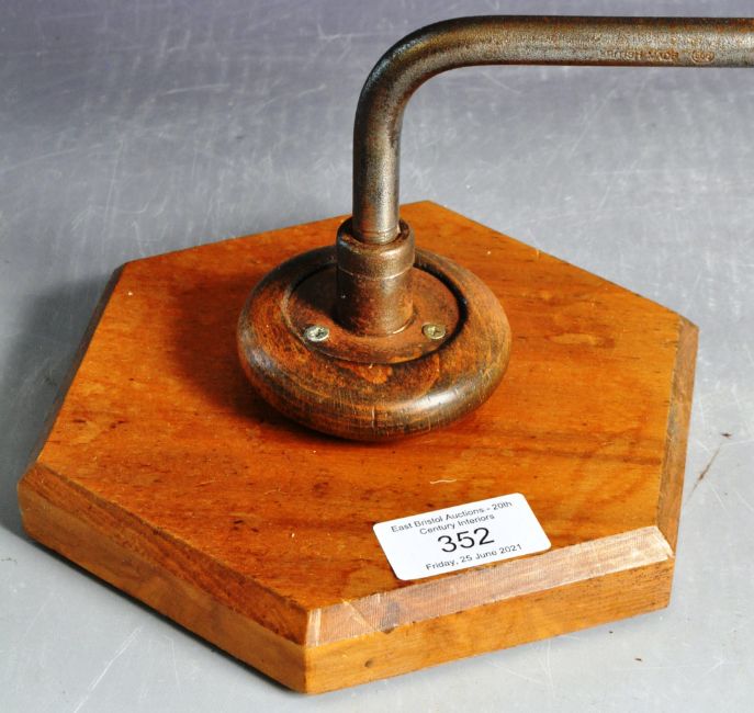 A retro vintage 20th Century English upcycled / repurposed hand held drill converted to a steampunk industrial table / desk lamp light. The bespoke lamp of typical form mounted upon a oak hexagonal base. Condition; sold as untested, age related ware, good example. Measures approx; 39cm x 17cm diameter.