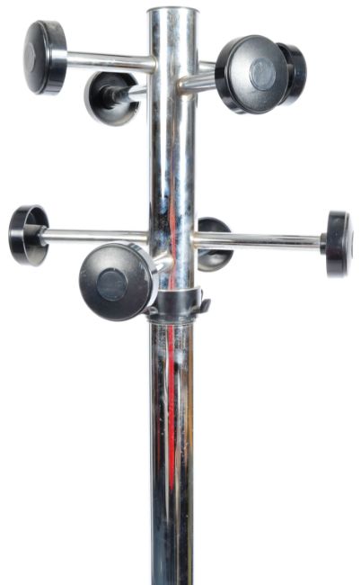 A retro vintage 20th Century chrome floor standing coat stand / hat stand having a multi branch top with black plastic hanging discs with central chrome tubular column with four section stick / umbrella stand raised on tubular supports. Measures approx.; 174cm x 58cm.