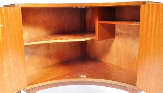 Greaves & Thomas - A retro vintage 20th Century walnut corner cupboard / display music cabinet of inverted bowed form having double doors with brass knob handles opening to reveal a shelved interior. All being raised on taping supports having brass caps. Condition; marks to the top with some age related marks. Measures approx; 71cm x 97cm x 61cm.