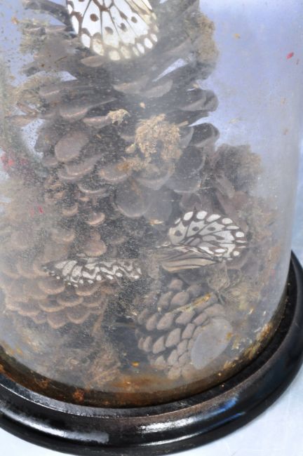Taxidermy & Natural History - Lepidopterology - An antique 19th Century Victorian butterfly specimen group display featuring two Large Tree Nymph Idea leuconoe Paper Kite butterflies housed within a glass dome. Neatly presented with pinecones and foliage. Some wear to the specimens, dome is in very good condition and fixed to the base. Measures approx 30cm tall.