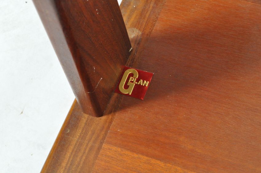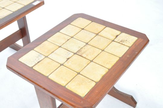 G Plan - A retro vintage 20th Century British design teak wood tile top nest of tables. The nesting tables with teak top surrounds set with a series of cream tiles. Each table raised on ski legs united by stretchers. Label present. Condition; age related wear mostly to the tiles, overall good. Measures approx; 46cm x 50cm x 43cm.