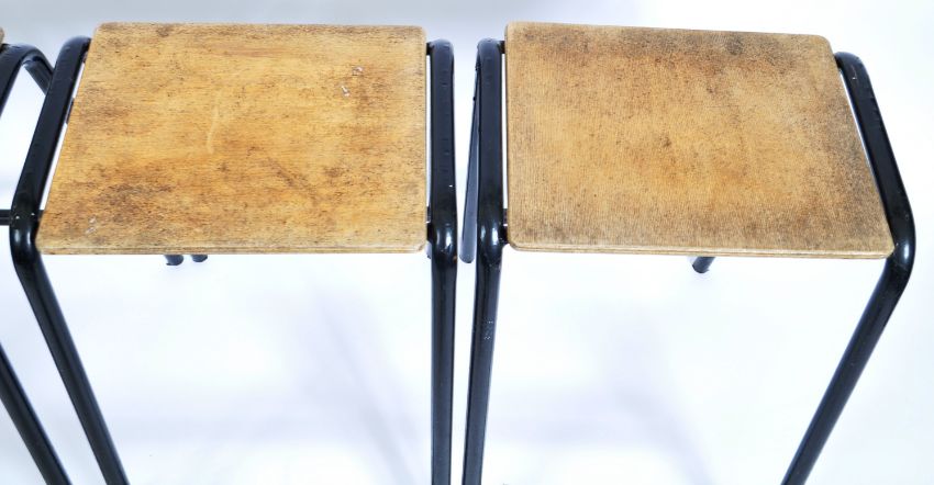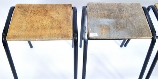 A set of four retro vintage mid 20th Century 1950's stacking Industrial scientific lab stools having beech wood panel seats set to black tubular metal leg united by tubular scratchers. Condition; some age related wear, minor marks but overall in good condition. Measures approx; 60cm x 38cm x 48cm.