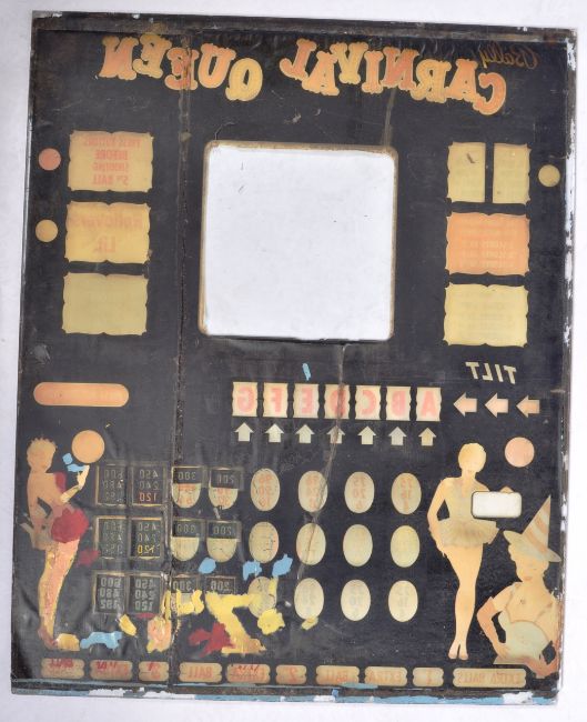 An original mid Century retro vintage amusement arcade machine glass display fixture from a Bally ' Carnival Queen ' pin ball machine. Colourful artwork depicting a beachfront carnival celebration scene with a clear central square. Measures approx 79x63cm.