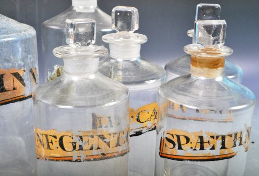 A collection of antique 19th Century Victorian apothecary shop display poison / medicine bottles of cylindrical form with glass stoppers to the top, each having applied labels, comprising clear glass examples. All in good condition other than wear to the labels and clouding to the glass, some minor marks to the stoppers but overall in good condition with no visible signs of major damage. Tallest measures approx 25cm high.