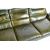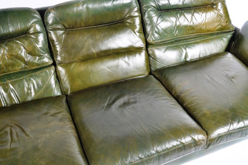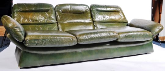 An original retro vintage mid 20th Century 1970s Italian style full grain leather three-seater sofa settee. Green leather, with open egg shaped form. Removable cushions, on a leather covered pedestal base. Size approx; H90cm x W217cm x D89cm.