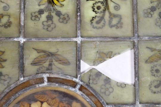 A collection of antique vintage stained glass / leaded glass window panels comprising a triangular shaped examples with a pair of smaller square examples. Well detailed examples in fair condition. Largest measures approx; 50cm x 87cm.