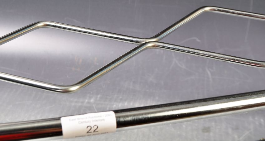 A retro vintage 20th Century chrome set of coat hooks having a crisscross scissor luggage rack top with tubular bar set with six coat / hat hooks. Measures approx; 73cm wide.