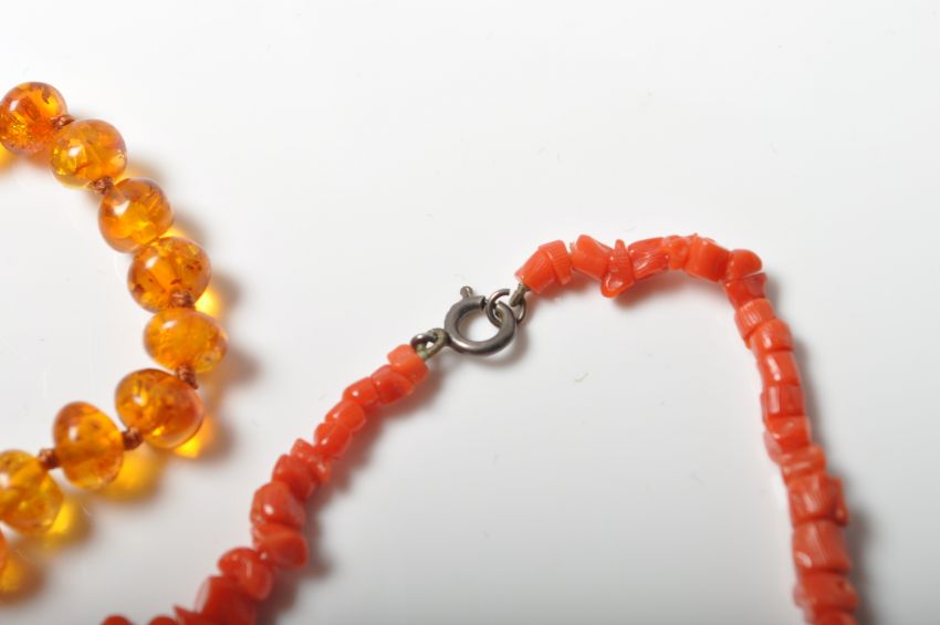 A vintage natural amber bead necklace with stamped 925 silver lobster clasp alongside a coral branch necklace also with stamped 925 silver clasp. Measures 60cm in length. Total weight 63.36g.