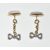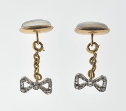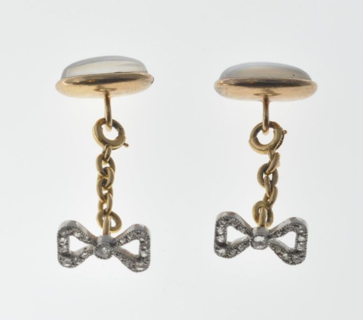 A pair of French 18ct gold cufflinks, the heads being set with oval moonstone cabochons the backs being in the form of bows set with diamond accent stones united by chains with a spring ring clasp attachment. Eagle marks to the chains. Weight 8.6g. Moonstones measure 13mm high, bows measure 13mm wide.