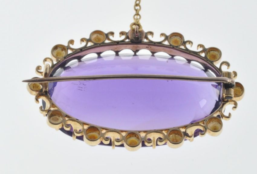 A 20th Century gold brooch set with a large oval cut amethyst having an open work mount set with seed pearls, complete with safety chain. Gold unmarked but tests indicate 18ct to the mount and 9ct to the pin. Amethyst measures approx 35mm wide. Brooch measures 14.2cm wide.