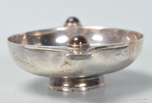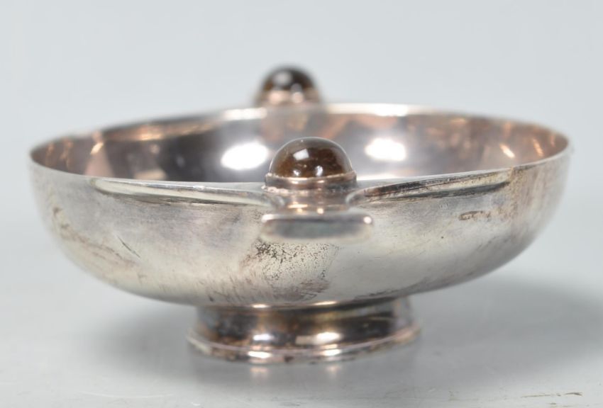 A Scottish provincial silver hallmarked quaich by Robb of Ballater, having twin handles with two collet set yellow stones upon a circular foot which is marked to the underside. Hallmarked for Edinburgh. Measures 62mm in diameter. Total weight 40.63g.