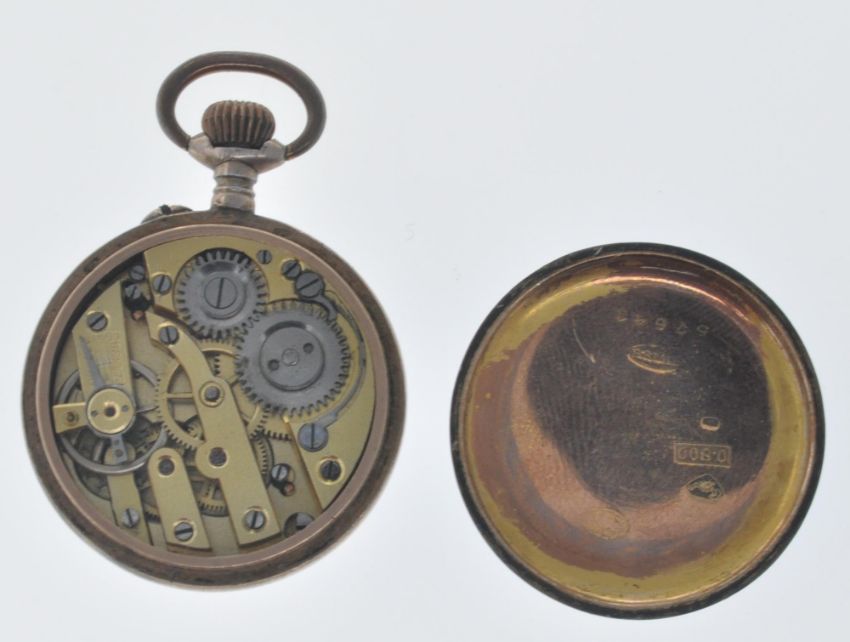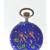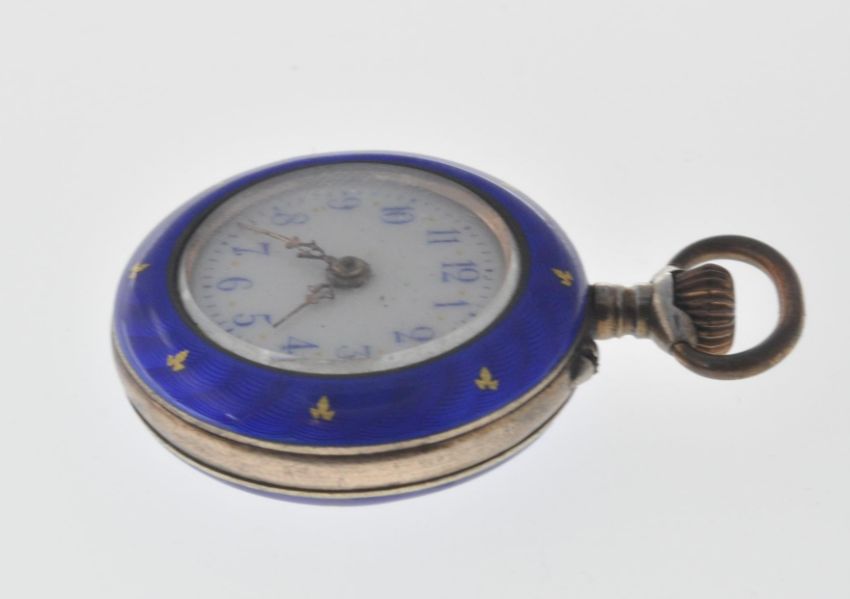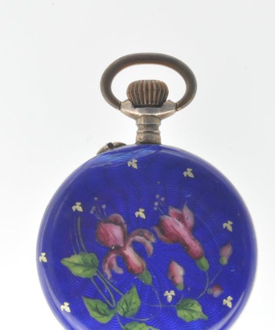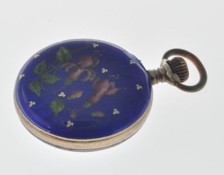An early 20th Century Swiss pocket fob watch having a blue guilloche enamelled case being painted with pink flowers and gilt ivy leaves, having a white face with blue arabic numerals to the chapter ring. Case marked swiss 800 Argent Dore. Small area of damage to the enamel but other wise good condition. Measures 2.7cm diameter.