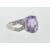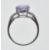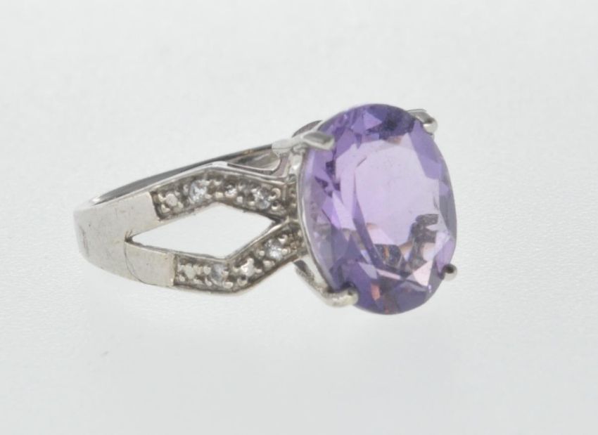 A hallmarked 9ct white gold ring having a large oval cut purple stone with pierced shoulders being set with illusion set diamonds. Ring size L.5. Total weight 3.0g