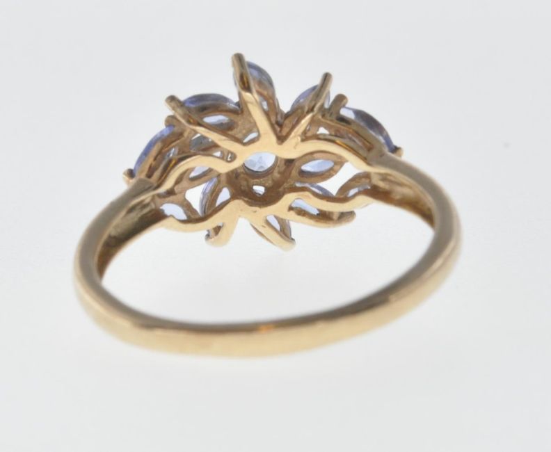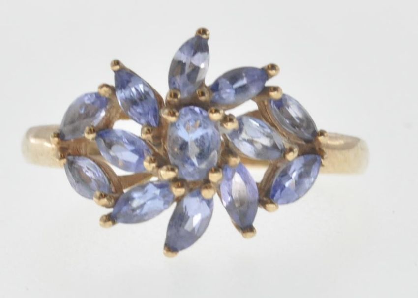 A 9ct gold ring set with a cluster of marquise cut purple stones. Assay marked London on the inside of the band. Weight 2.2g. Size O.5.