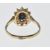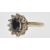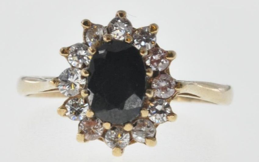 A hallmarked 9ct gold sapphire and CZ cluster ring having a central oval cut sapphire prong set with a halo of round cut CZ white stones. Hallmarked Birmingham 1989. Weight 2.0g. Size P.5.