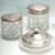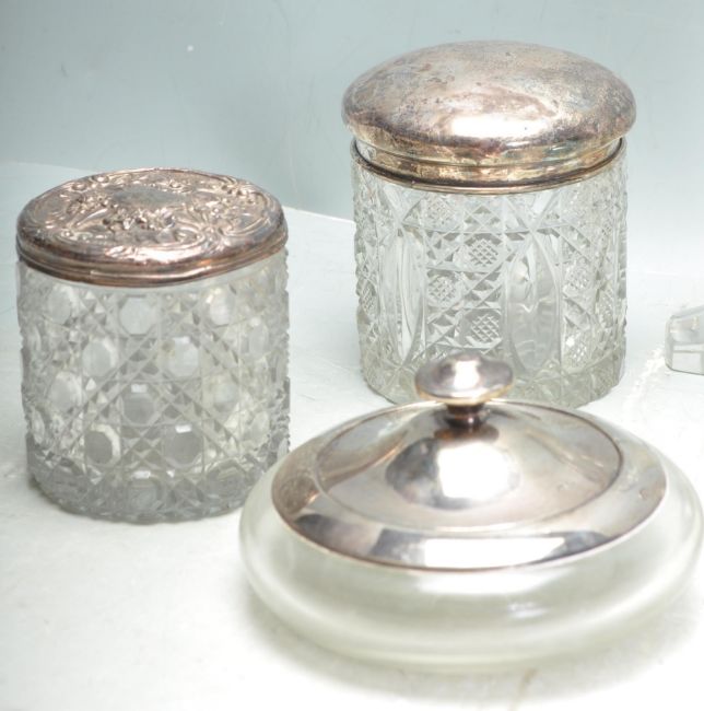 A large collection of Edwardian early 20th century cut glass and hallmarked silver dressing table pots and boxes to include an oval silver lidded vanity pot with cherub atop hallmarked the Boots Pure Drug Company, 1907, a large cotton pad jar hallmarked for a Robert Pringle & Sons, a cut glass powder pot hallmarked for F H Adams & Co and may more examples 14cm tall. Silver lids measuring 113g.