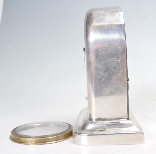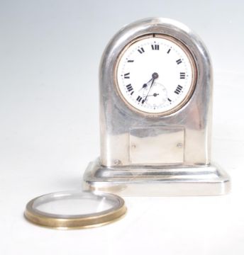 An early 20th century hallmarked silver mantle clock of domed form upon a stepped plinth base. The clock movement being swiss made and the face having roman numeral to the chapter ring. Hallmarked for Birmingham, 1916. Measures 10cm tall.