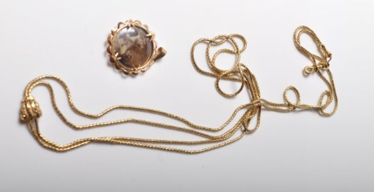 A french antique 18ct gold antique pocket watch chain having a fine knitted link chain having a clasped hand fixture to the clasp and a sliding acanthus leaf space together with a yellow metal locket of round form. Clasp marked with eagle marks. Chain measures 65cm. Weight 17g.